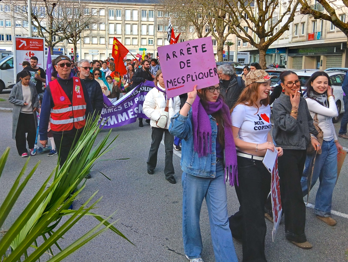 Près de 600 personnes ont participé à un rassemblement puis un défilé au départ de la place de l’Amérique Latine dimanche 8 mars 2026 à l’appel de l’intersyndicale CGT, FSU, Solidaires, du Planning familial, de Femmes solidaires, Choisir la cause des femmes, de la Ciivise ou encore de Jeunesse nazairienne engagée.