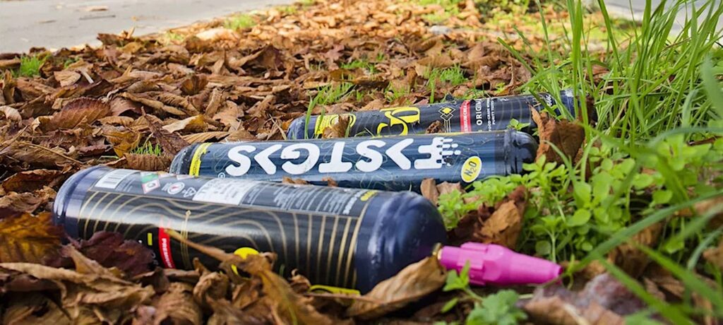 Bonbonnes de protoxyde d’azote abandonnées dans la nature – © Xavier Francolon / SIPA