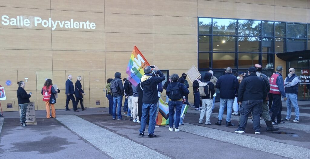 À l’entrée de la salle, une cinquantaine de personnes venues manifester leur désaccord avec la tenue de cette réunion publique du candidat RN et la présence de la vice-présidente de l’UDR.